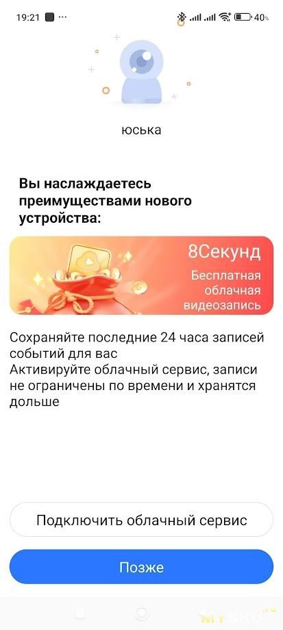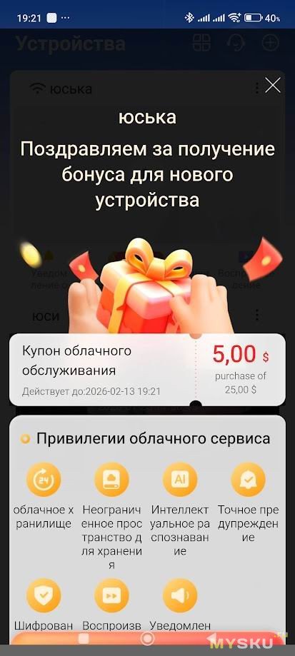Приложение просит дать камере имя и указать тип использования, а затем появляется уведомление, что за полнофункциональное использование (облачное хранилище, AI помощник) придётся заплатить за подписку. Неприятно, но не смертельно, бесплатный функционал у камеры вполне богатый и большинству его хватит за глаза. Также предлагается купон на пробный период полнофункционального тестирования.