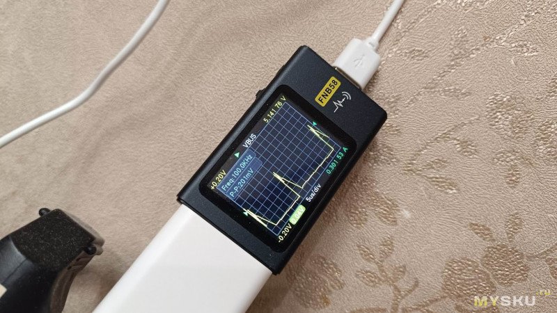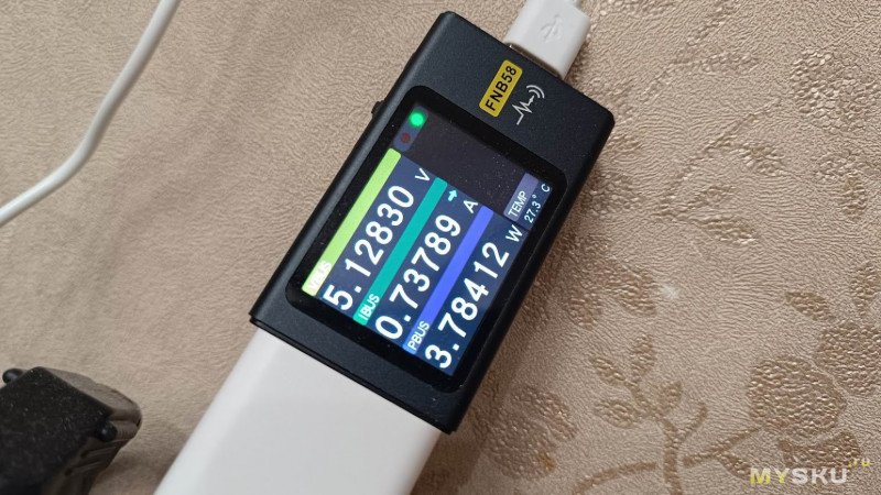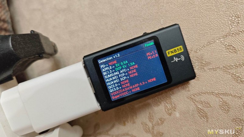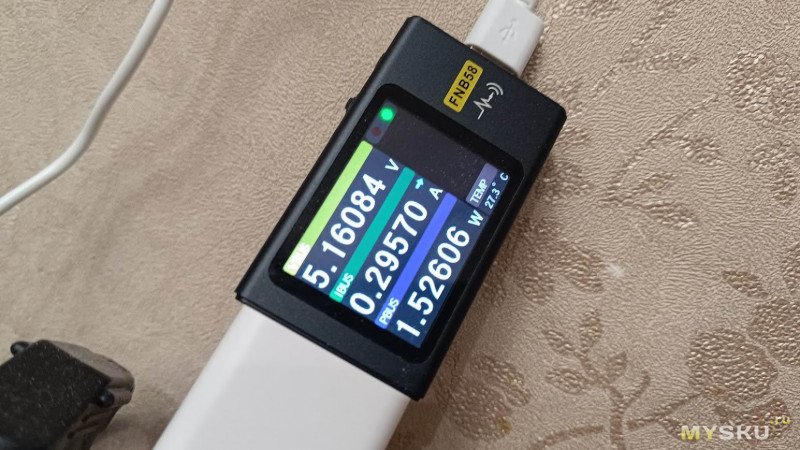 Включаем камеру в электросеть и проверяем параметры зарядного блока. Никаких быстрых протоколов он не поддерживает, а максимальный ток, который он может выдать 1,5 А, что меньше заявленных 2 А.