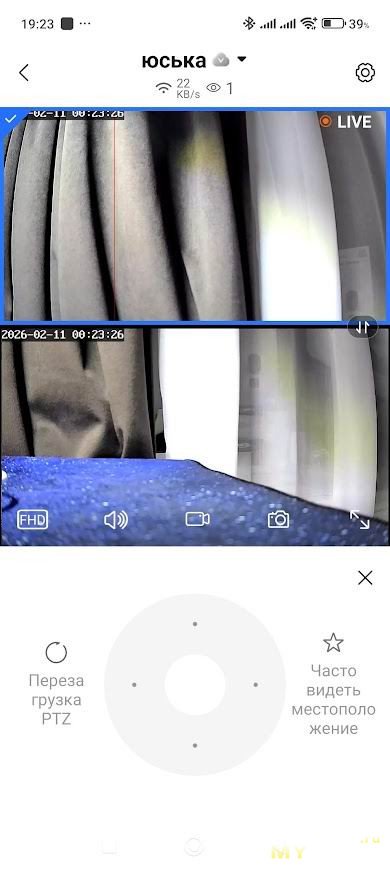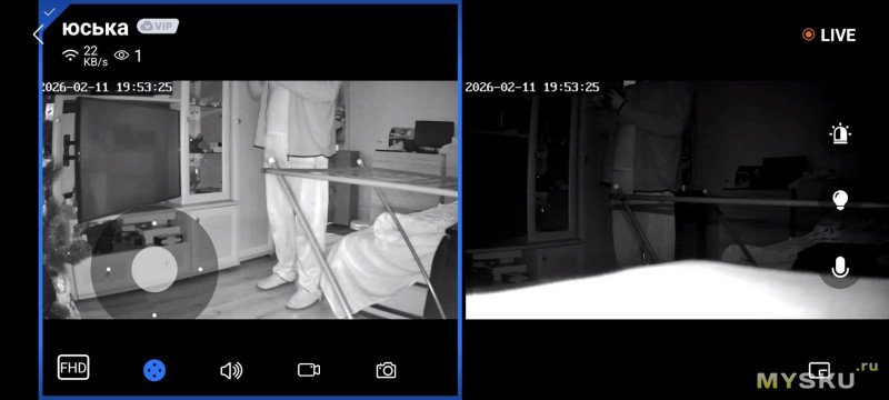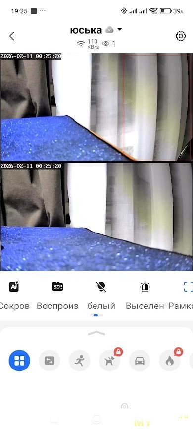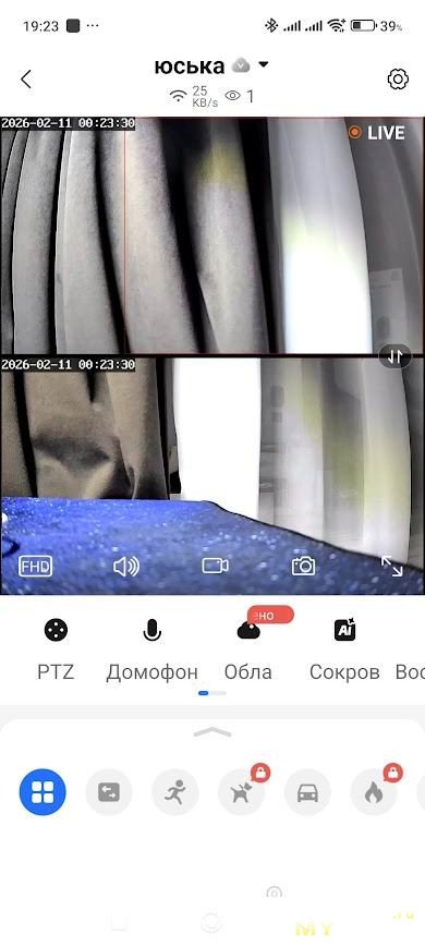 Далее мы попадаем на главный экран приложения, где сразу видим в двух окнах видеопотоки с двух камер в реальном времени с небольшой задержкой. Здесь же находятся иконки, активирующие весь функционал камеры: PTZ управление с поворотом камеры на 360°, просмотр записей с карты памяти или облачного хранилища, двусторонняя аудиосвязь с возможностью не только слушать через динамик камеры, но и говорить самому через встроенный микрофон, да еще и с функцией изменения голоса.