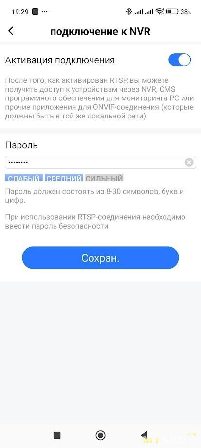Для использования камеры по протоколу ONVIF нужно в приложении перейти в «Настройки», затем «Больше настроек», открыть пункт «подключение к NVR» и активировать его. Затем надо задать пароль устройства — он будет использоваться для ONVIF/RTSP авторизации.