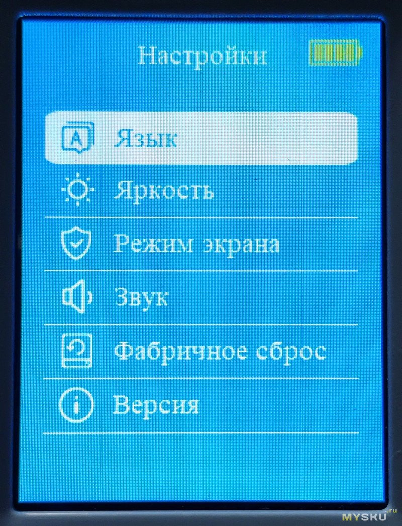 В настройках можно изменить язык, яркость и время работы дисплея, уровень громкости и сделать общий сброс.