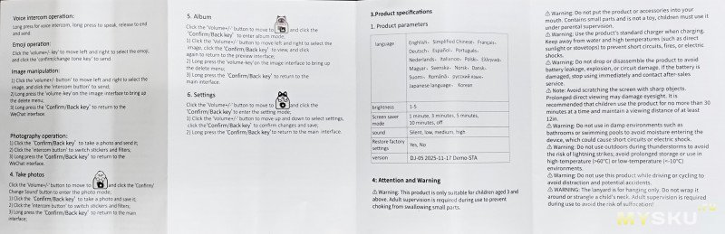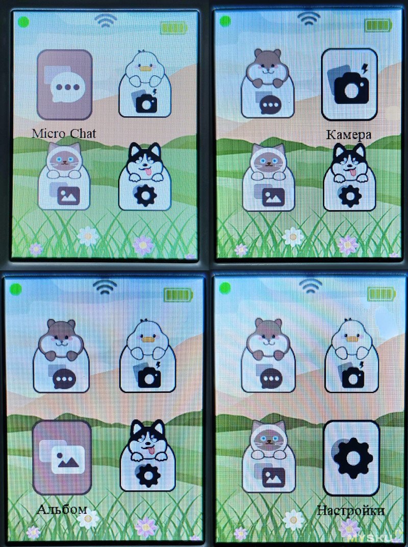 Включаем. Меню состоит из четырёх элементов — micro чат, камера, альбом, настройки. Выбор кнопками громкости, вход и выбор чего либо — нажатие верхней кнопки, выход — зажатие той же кнопки.
