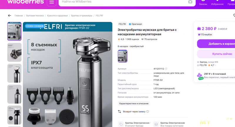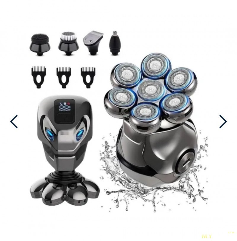 Машинка работает на встроенном аккумуляторе, может работать и от сети. В комплекте куча насадок: триммер, круглая насадка для носа и ушей, массажные щетки.