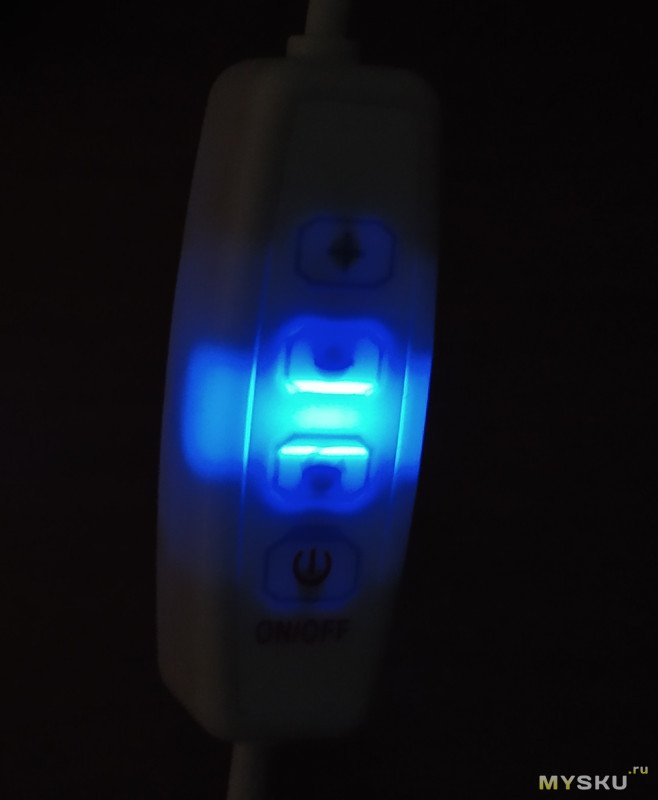 Нижняя — включение / выключение. Чуть выше — переключение цветовой температуры светильника. Всего три варианта, переключаемых по кругу: 1) холодный свет, 2) теплый свет и 3) нейтральный (по факту горят светодиоды и холодного цвета и теплого). Еще выше — кнопки + и — соответственно для увеличения / уменьшения яркости лампы. Если на лампу подано питание с USB разъема выключатель неярко светится синим.
