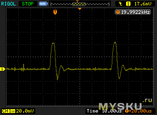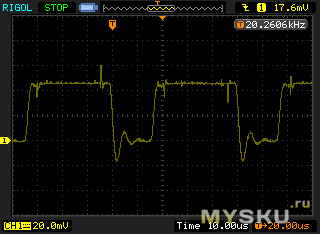 Для измерения потребления включил лампу через USB тестер. Показания существенно скачат. Подключил осциллограф к резистору 25 мОм в USB тестере (используется там для измерения тока). И увидел такую картину
