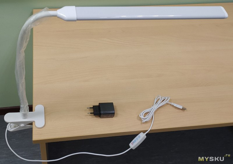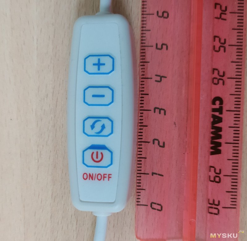 Длина самого светильника 36 см. Из них светящаяся часть — 30 см. Гибкая ножка — 40 см. Длина провода от прищепки до выключателя 46 см. От выключателя до USB разъема — 144 см. На выключателе 4 кнопки.