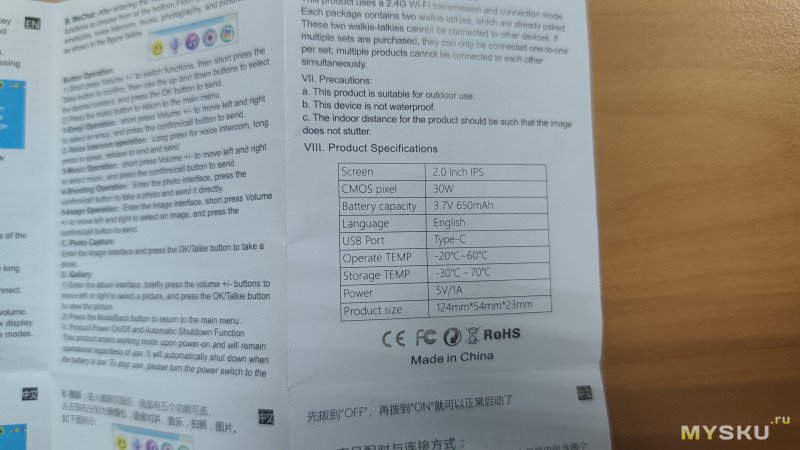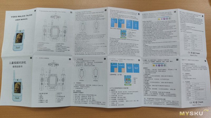 Итак. Размер упаковки 14х14.5х3.8 см. не большая. В коробке пластиковый ложемент, в котором аккуратно разместились 2 рации, два кабеля usb-a на type-c для зарядки длиной 30 см, и почему-то один шнурок для рации что бы можно было вешать на шею, ну и конечно же инструкция на английском, китайском, французском и немецком языках, русского к сожалению не завезли. Но и без инструкции вполне легко можно разобраться с данной игрушкой.