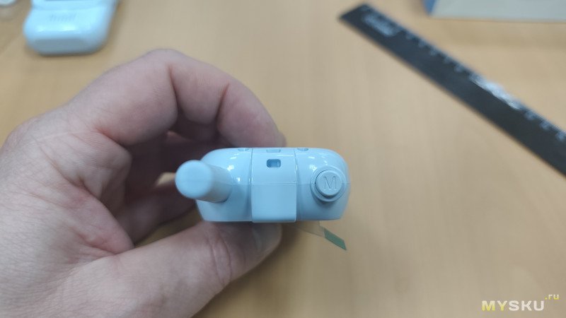 На левом торце расположены ползунок (включение/выключение рации) и клавиши ± которые отвечают за регулировку громкости и навигацию по меню. На верхнем торце расположена кнопка “М”, она переключает режимы при долгом нажатии, а при коротком резеда меню. С правого торца кнопка разговора и она же выполняет функцию выбора “ОК”, чуть ниже кнопки расположено гнездо зарядки и индикатор зарядки.