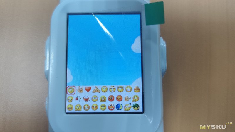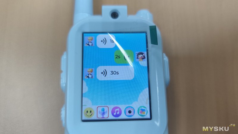 2. Голосовое общение. Так же напоминает мессенджеры, когда отправляешь голосовые сообщения. При нажатии кнопки разговора запускается запись, максимальная длина записи 30 сек. После того как вы отпускаете происходит отправка сообщения собеседника и у него сразу же происходит воспроизведение этого файла, повторить прослушивание можно путем длительного нажатия на кнопку MODE на верхнем торце. Также в сообщения есть небольшое меню из 5 пунктов. 1 смайлики, их там 36 штук. 2 микрофон, через него происходит отправка голосовых сообщений. 3 музыка, коротенькие мелодии и песенки в количестве 4х штук. 4 фото, можно отправить себяшку собеседнику. 5 галерея, тут можно выбрать фото которое вы ранее делали, но разумеется камера одна поэтому лучше всего получается делать только себяшки.