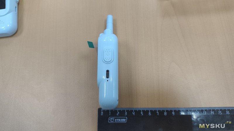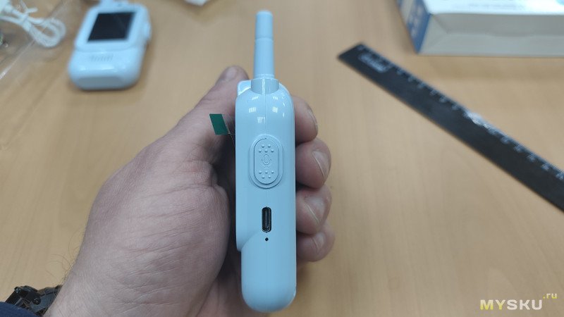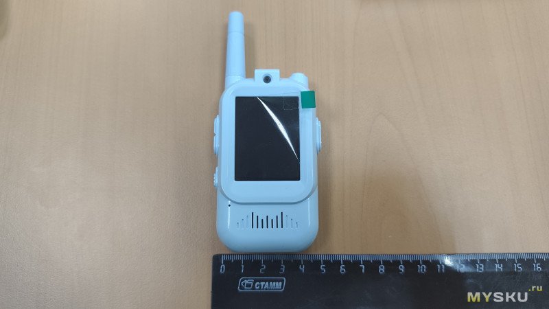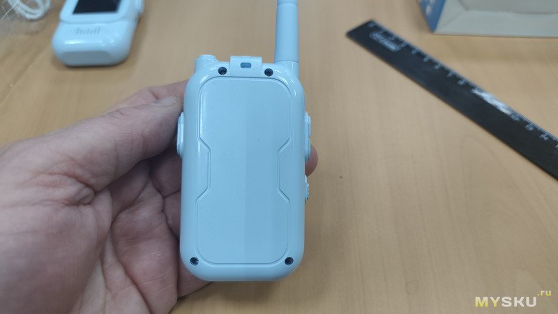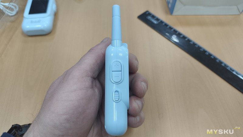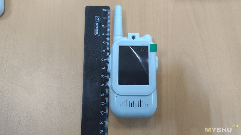 Сама рация высотой 12.4 см (это в месте с антенной), шириной 5.4 см, ну и толщиной 2.3 см. Вполне удобно разместиться в детской руке.