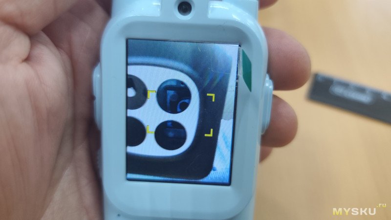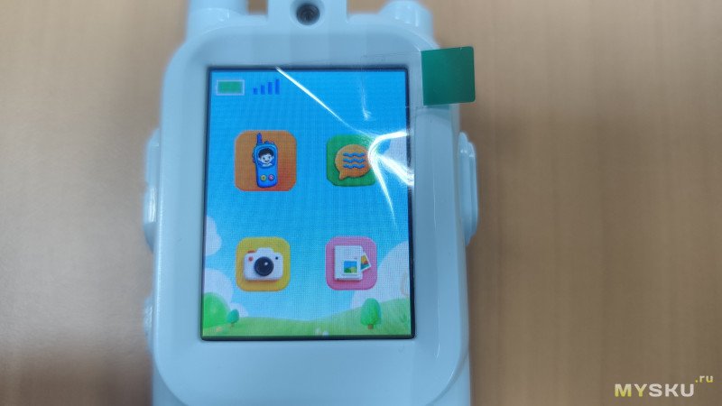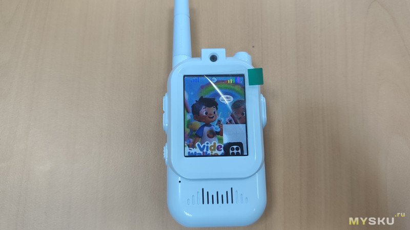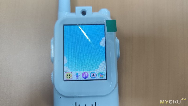 На передней панели расположена камера. Она без защитного стекла но в небольшом углублении. Поцарапать линзу конечно сложно, но учитывая что рацией будет играть ребенок, чистить ее будет не очень удобно. Под камерой расположился дисплей диагональю 2 дюйма (3 на 4 см). Качество дисплея достаточно хорошее, яркий, иконки видно хорошо. При повороте изображение не уходит в негатив. Под дисплеем расположены микрофон и динамик. Почти все как у обычной рации, отличается только наличием камеры и дисплея.