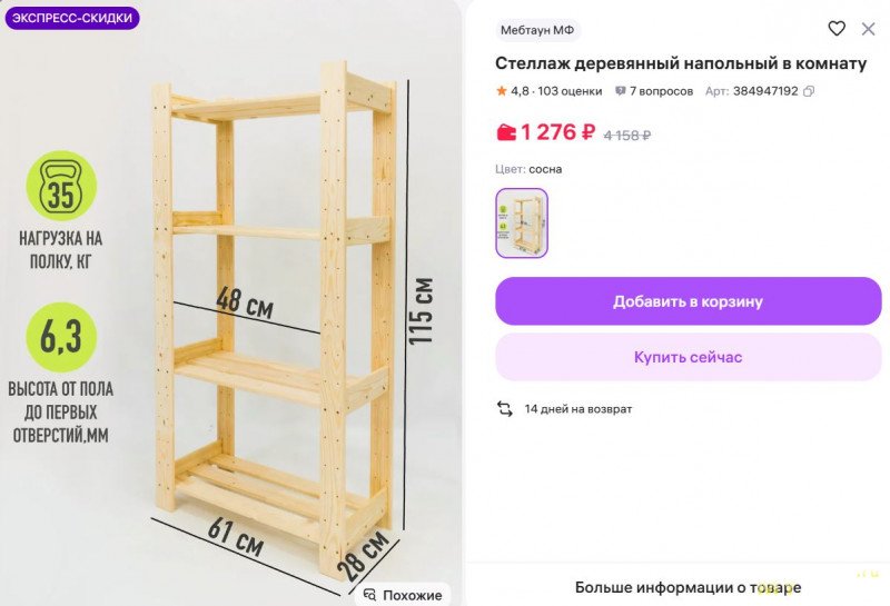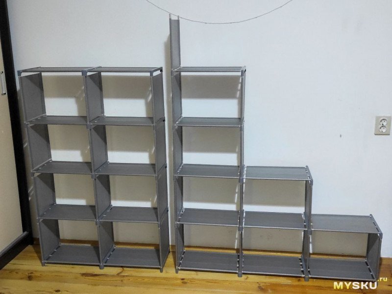В общем неплохой стеллаж, который при этом можно собрать в разных вариантах. Нагрузку выдерживает, не раскачивается. Можно разбирать и собирать повторно в разных вариантах, можно сделать из него 2 или 3 стеллажа.