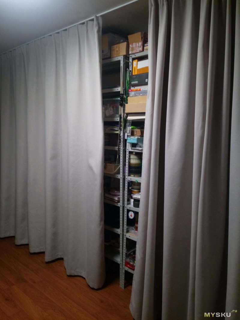 «шторки» стеллажа сделаны из нетканого материала, похожего на ткань мешков от пылесоса. Боковые части натянуты на трубки, горизонтальные посвободнее. Тканевые части можно не использовать, если они заслоняют свет.