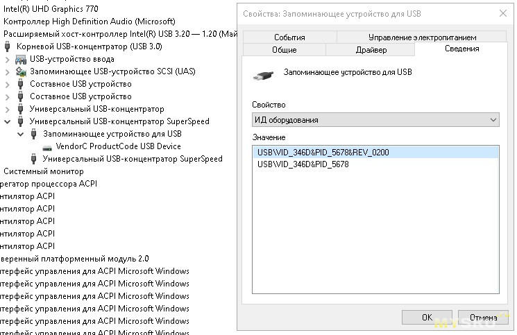 ChipEasy, ChipGenius и Flash Drive Information Extractor не смогли определить использованные контроллер и память, есть только ID оборудования: