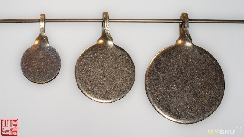 Металл, из которого гонги изготовлены, мягкий, царапается даже гвоздём, и хорошо магнитится. В описании продавца этот металл обозначен как «марганцевая сталь»; насколько правдиво сие утверждение, сказать не могу, но если это действительно так, не стоит надолго оставлять гонги под открытым небом, если не желаете однажды обнаружить их покрытыми ржавчиной.