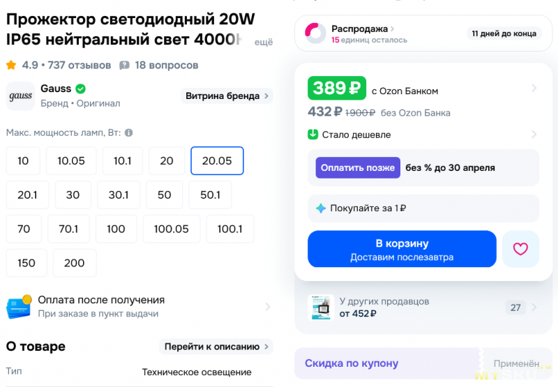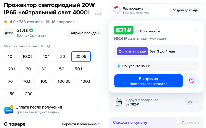 Но, уже сегодня цена у меня на этот прожектор — 621 рубль «со скидкой по купону» ))