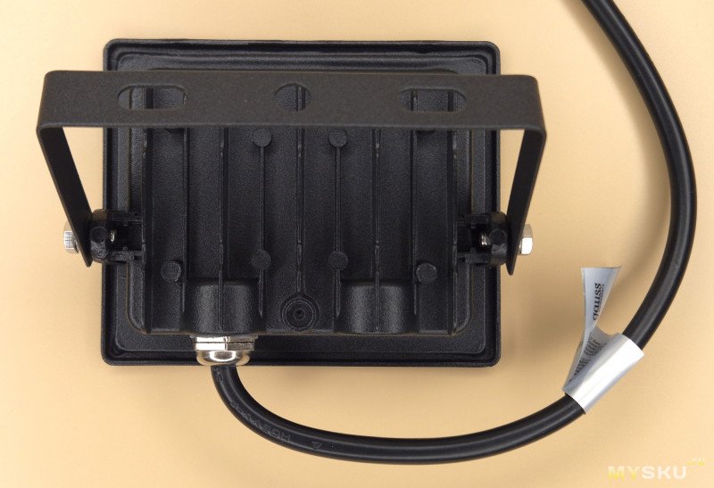 В целом, дизайн у него весьма приятный – на лицевой стороне указано имя бренда и серия, что уже является хорошим признаком (то есть, это не перемаркированный ОЕМ-продукт). В качестве источника света в прожекторе используются 20 отдельных SMD-диодов, что может и не смотрится так же красиво как СОВ-матрица, но тоже вполне нормально. Задняя стенка прожектора традиционно выполняет роль теплоотвода и снабжена небольшими ребрами для увеличения эффективной площади. По бокам к задней стенке крепится скоба-держатель, угол наклона которой можно регулировать: