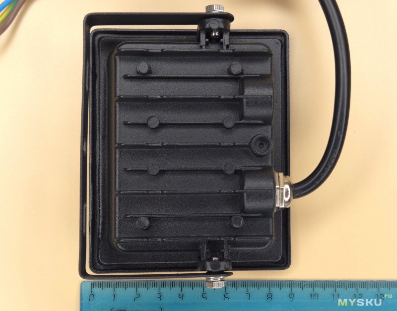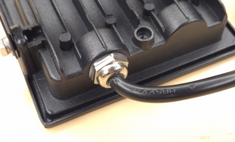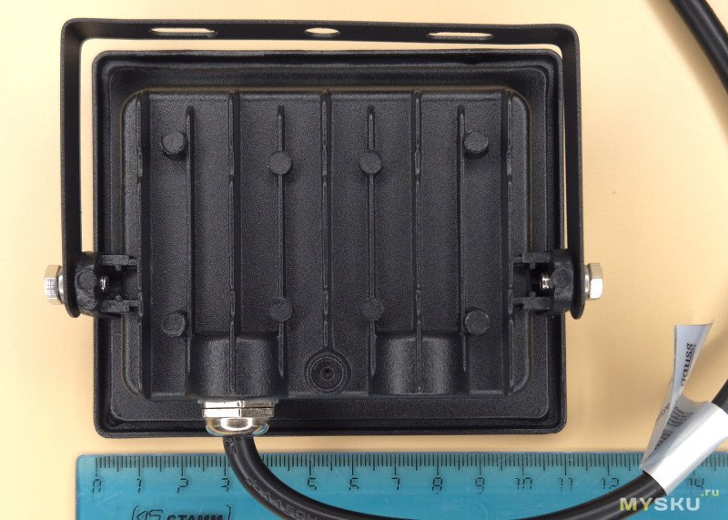 Это означает, что стенка выполнена из какого-то легкого металла, скорее всего, одного из сплавов алюминия. Это не может не радовать, ведь сейчас вполне попадаются прожекторы, где теплоотвод выполняется прямо из пластика. Работать такой теплоотвод нормально не будет, разве что создавать видимость. Но в этом прожекторе с теплоотводом всё нормально.