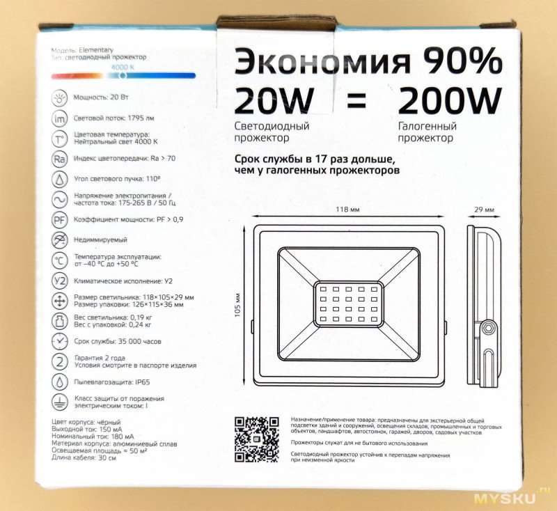 Внутри которой находится прожектор в пакете, а также небольшая инструкция, которую я даже не открывал, т.к. все характеристики указаны прямо на коробке. Если вдруг по какой-то причине она вам интересна, напишите в комментариях, сделаю её фото. Кстати, обратите внимание, на коробке нигде отдельно не сказано, что прожектор не имеет пульсаций. Сам прожектор выглядит следующим образом: