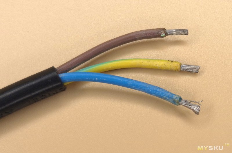 А длина комплектного кабеля составила примерно 27 сантиметров. Сам кабель достаточно толстый, думаю, полтора квадратных миллиметра в нем точно есть. Кончики проводов облужены и пропаяны, но выглядят несколько непрезентабельно: