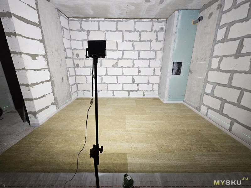 Площадь порядка 12 квадратных метров прожектор освещает до уровня, вполне комфортного для выполнения ремонта. Конечно, одного такого прожектора на всё помещение не хватит, однако в качестве дополнительного переносного освещения он прекрасно подходит.