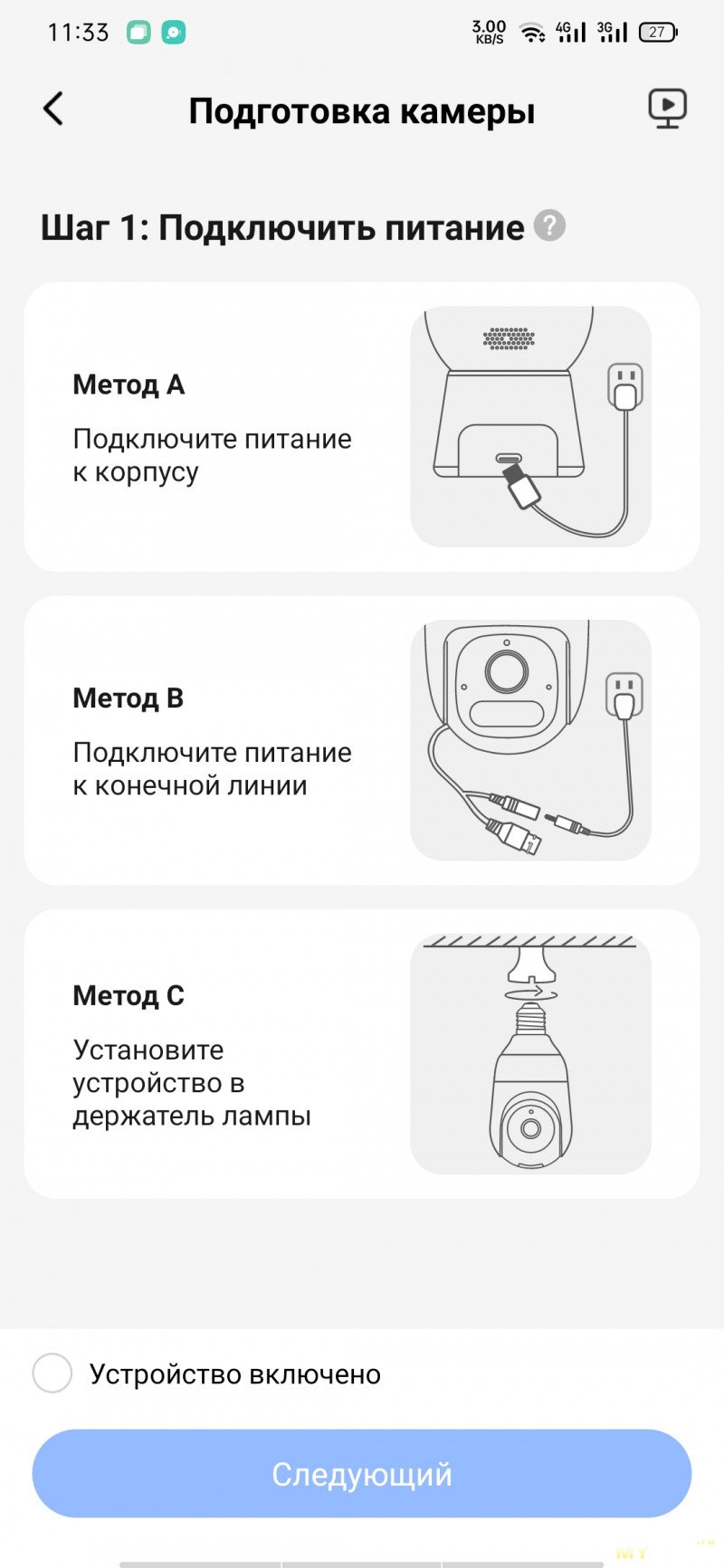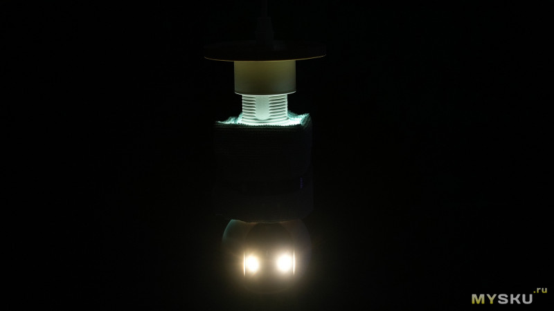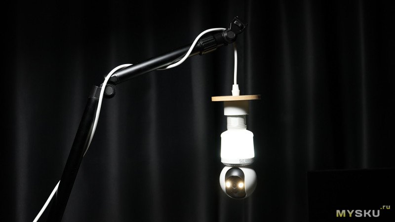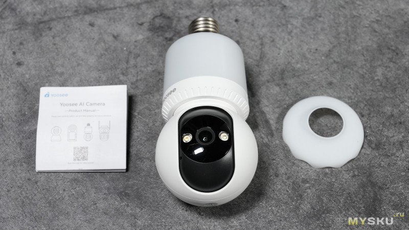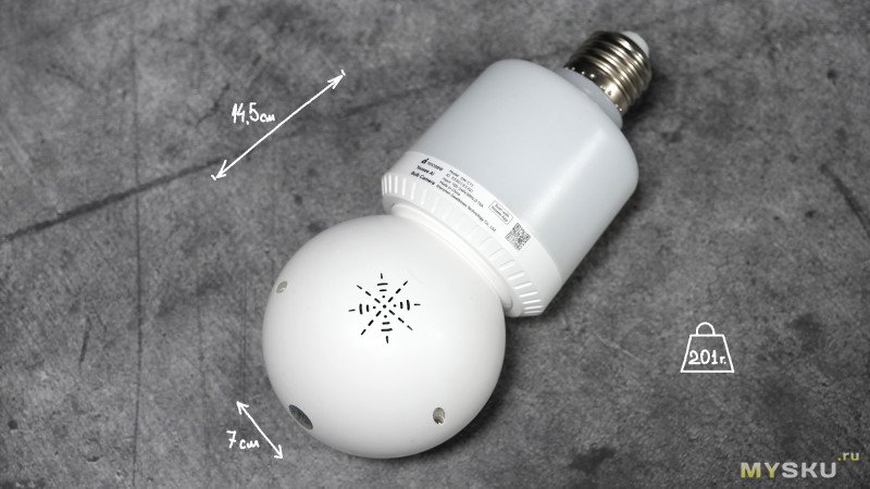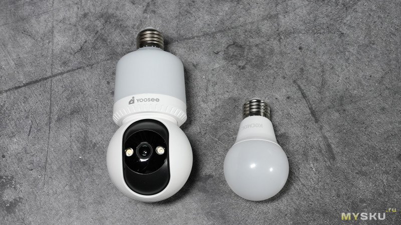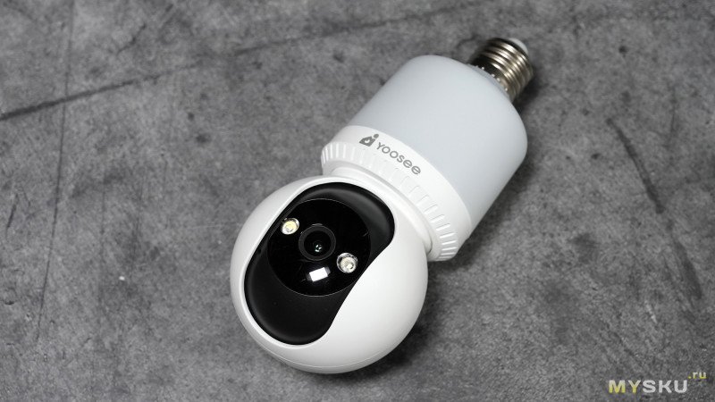 Камера условно состоит из двух частей корпуса: стакан с резьбовым цоколем Е27 и подсветкой + сфера с камерой и подсветкой. Девайс имеет только один способ подключения к сети 220В — через резьбу Е27, что одновременно избавляет от необходимости занимать розетку и тянуть от блоков питания провода.