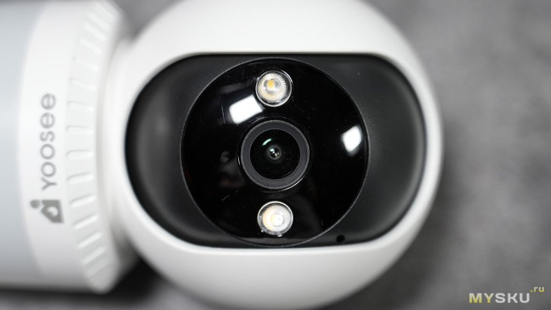 На передней стороне сферы в чёрной глянцевой части, которая по сути является ещё одной внутренней полусферой, находятся — камера на 3Мп (инфы про размер сенсора не нашёл), два светодиода тёплого свечения + пара светодиодов инфракрасного свечения 850нм.