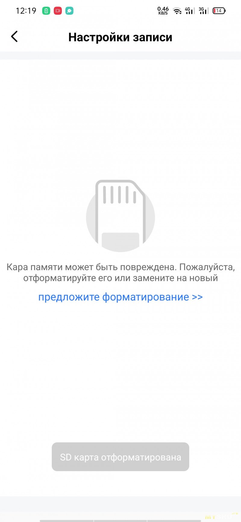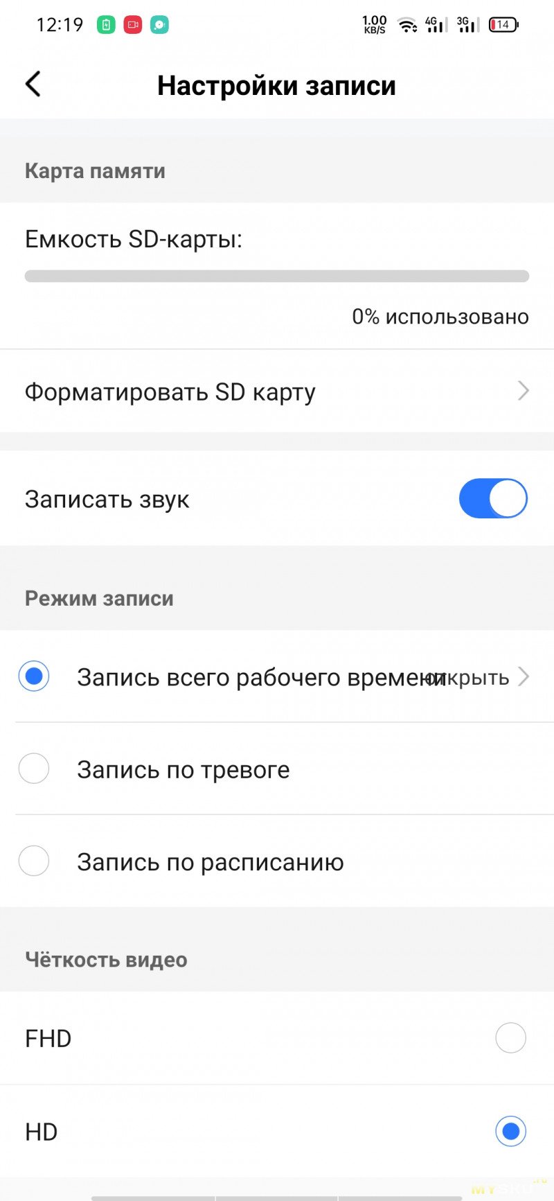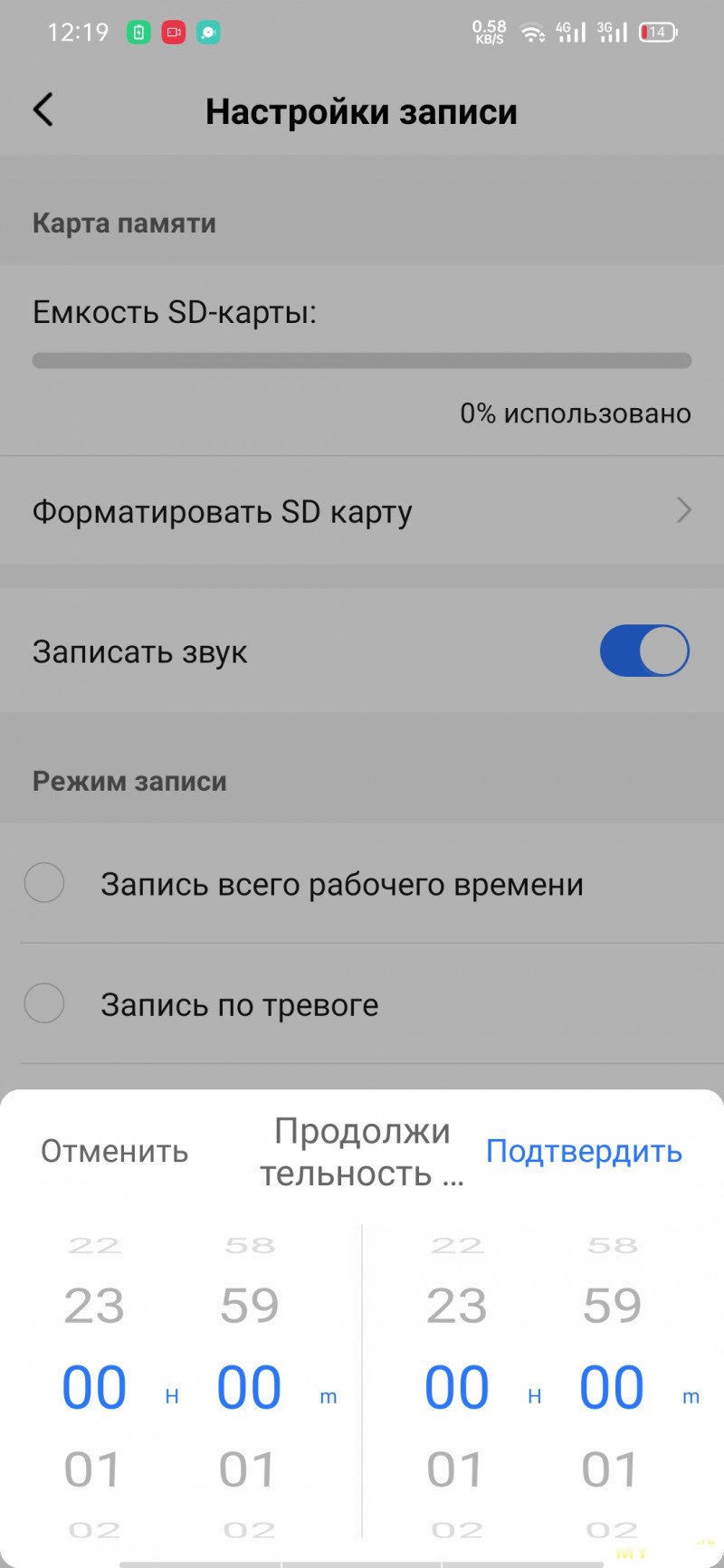 Опции управления картой памяти. Чтобы видео на неё записывались, карточку нужно отформатировать здесь же в устройстве. Можно выбрать, как вести запись — всё подряд, по тревоге или по расписанию.
