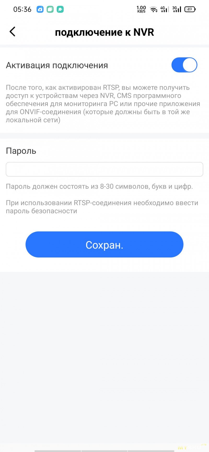 Для работы ONVIF сначала нужно активировать опцию «подключение к NVR» в «настройки -> больше настроек», назначить свой пароль и выписать LAN-IP из параметров камеры.