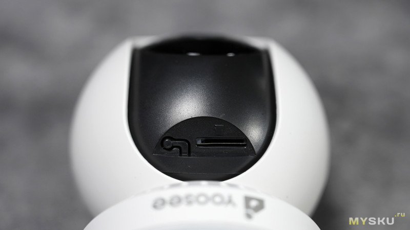 Если сдвинуть внутреннюю чёрную полусферу внизу от цоколя, приоткроется доступ к слоту microSD для карт памяти и кнопка сброса.