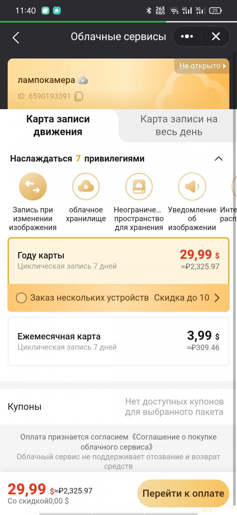 Как ни странно, со своими задачами лампокамера справляется. Изображение выдаёт обычное, попроще чем камеры от Xiaomi, но рассмотреть что-то можно, есть ночная ИК-подсветка, PTZ-поворот работает, AI-распознавание событий отрабатывает, PUSH'ы шлёт, ONVIF есть, видео на карту пишет, светильник бонусом. Этот вариант камеры можно рассматривать, если требуется максимально простой и незамороченый монтаж и подключение — достаточно найти всего лишь один свободный сокет Е27 на стене или потолке. Из минусов — байт на покупку подписки.— не требует блоков питания, только Е27
