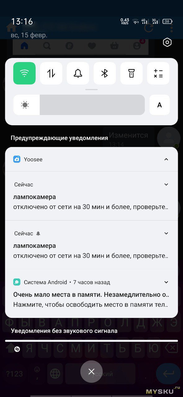 PUSH-уведомления приходят с задержкой в несколько секунд. Тип события помечается явно, как например тряска картинки, движение, плач ребёнка. Если вырубается электричество более чем на полчаса, — прилетает соответствующее уведомление.