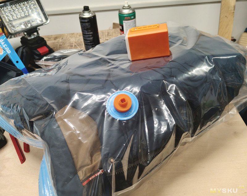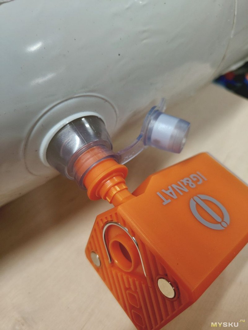 Дует, понятное дело, из бокового, сосет в центральное. Дует для такого малыша довольно сильно, и вполне справляется с надуванием не только мелочей типа подушек, туристических ковриков, но и чего покрупнее типа матрасов, кресел и, как потом будет понятно, может помочь надуть даже лодку или сапборд.