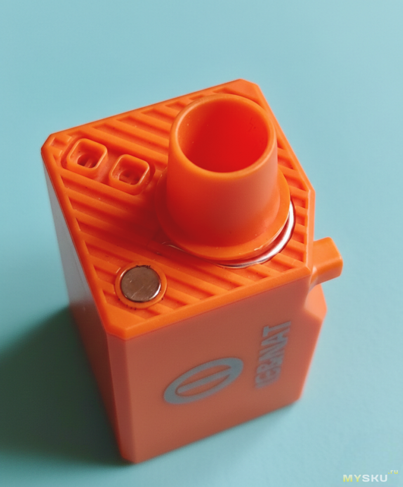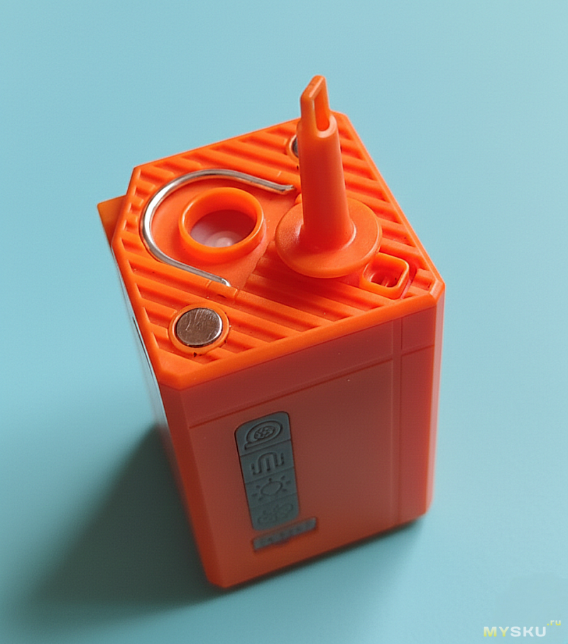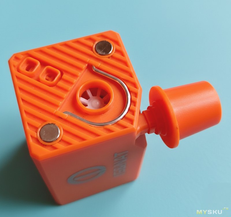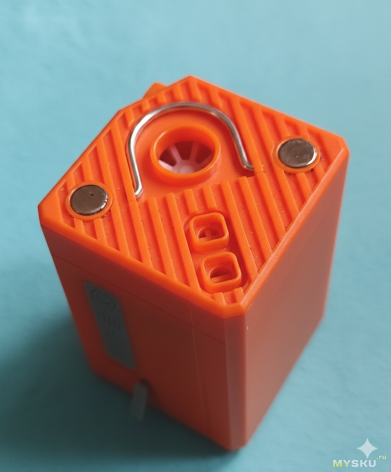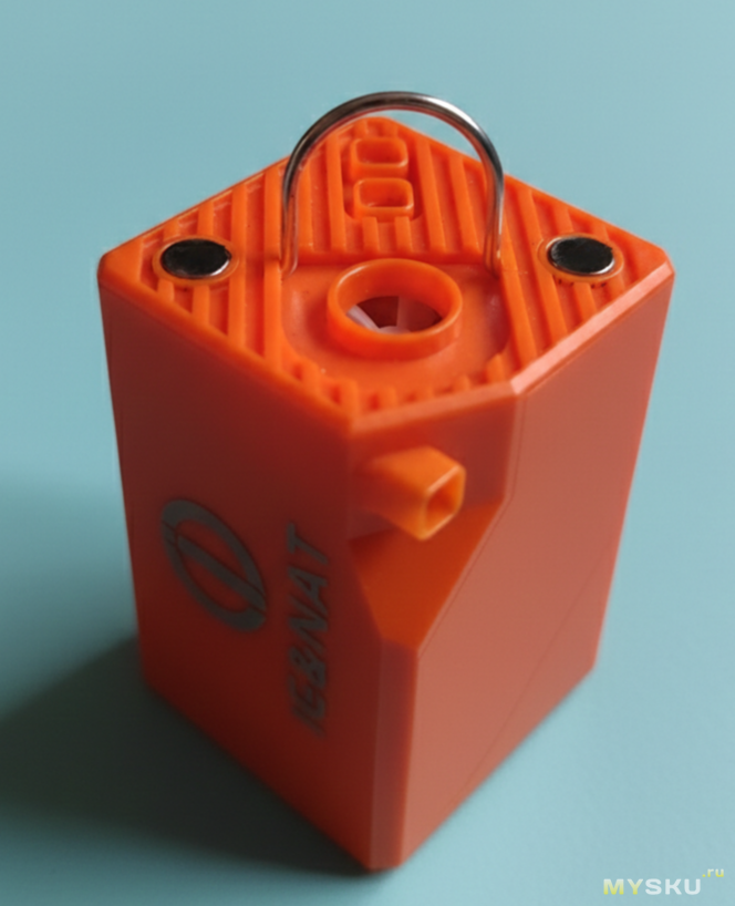 На верхней грани насосные порты: вход и выход насосика высокого давления и вход турбинки. Там же металлическая складная петля для подвешивания и пара магнитов для того же.