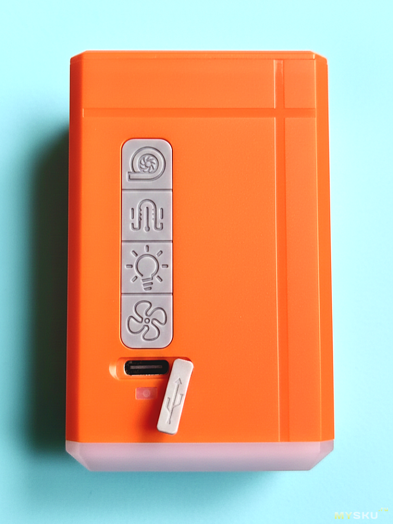 На одной из боковых граней выходное сопло турбинки, а на соседней — четыре резиновые кнопки управления, гнездо USB Type-C и светодиод индикации.
