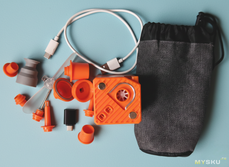 Неожиданная для насоса функция, однако тут она вполне полноценная и может пригодиться.Лопасти — это отдельный аксессуар, так что, когда есть нужда в вентилятора, их нужно извлечь из мешочка и установить на место. Крепление там магнитное, лопасти ставятся в одно движение, и надёжно держатся. Снимаются так же легко.