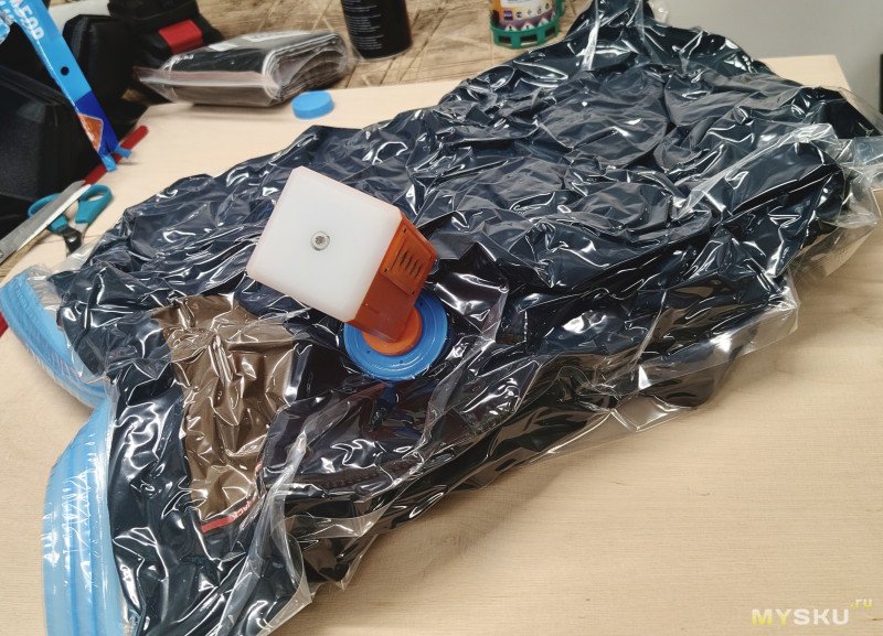 И это снова, как ни странно, скорее туристическая тема, подобный пакет — отличный компрессионный мешок для спальников, одежды и т.п. Если откачать из него воздух сначала турбинкой, а потом насосиком высокого давления, можно добиться очень плотной упаковки и напихать в рюкзак гораздо больше, чем без такого помощника. Заодно эти же пакеты послужат и гермомешками.