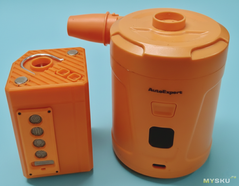 А вот наш герой со рядом со своим более традиционным старшим братом, популярной моделью туристического аккумуляторного насоса для матрасов и и.п.