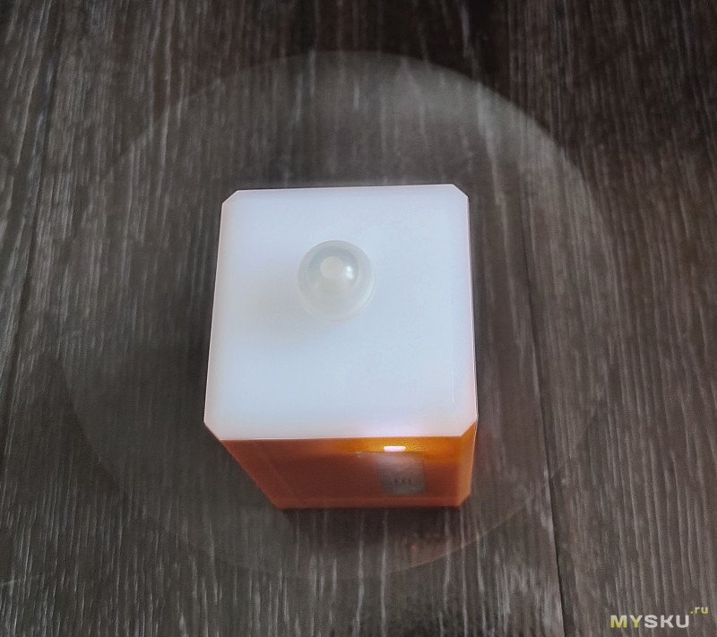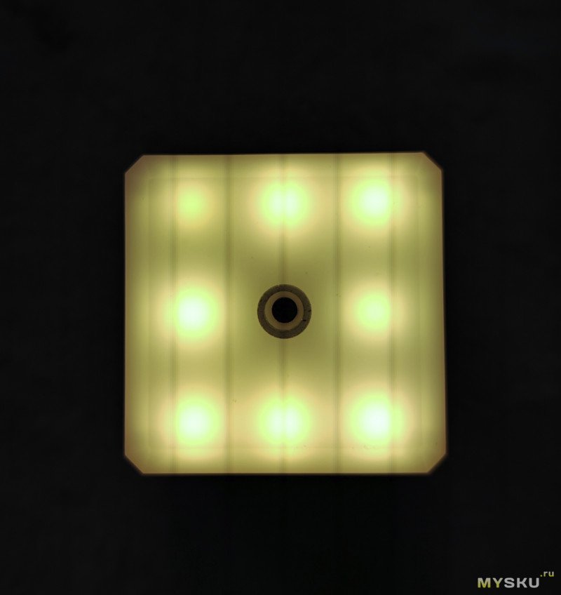 Светит восемью расположенными по периметру дна светодиодами, свет приятный теплый, яркости для кемпингового света или света в палатке более чем достаточно, а вот в качестве ночника в палатке самый слабый режим, все же, ярковат.