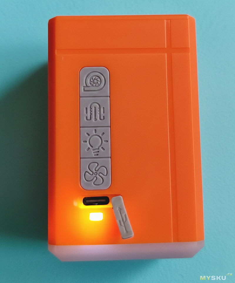 Вентилятор включается отдельной кнопкой, и имеет два режима по скорости вращения. Работает тихо, на первой скорости почти бесшумно, дует достаточно хорошо, чтобы ощутимо охладиться в каком-нибудь душном транспорте или в подобной ситуации. Часто такая штука просто спасает, проверено.