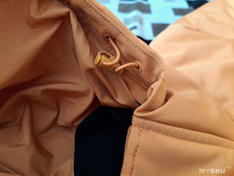 Есть внутренняя утяжка для регулировки «раструба» капюшона.