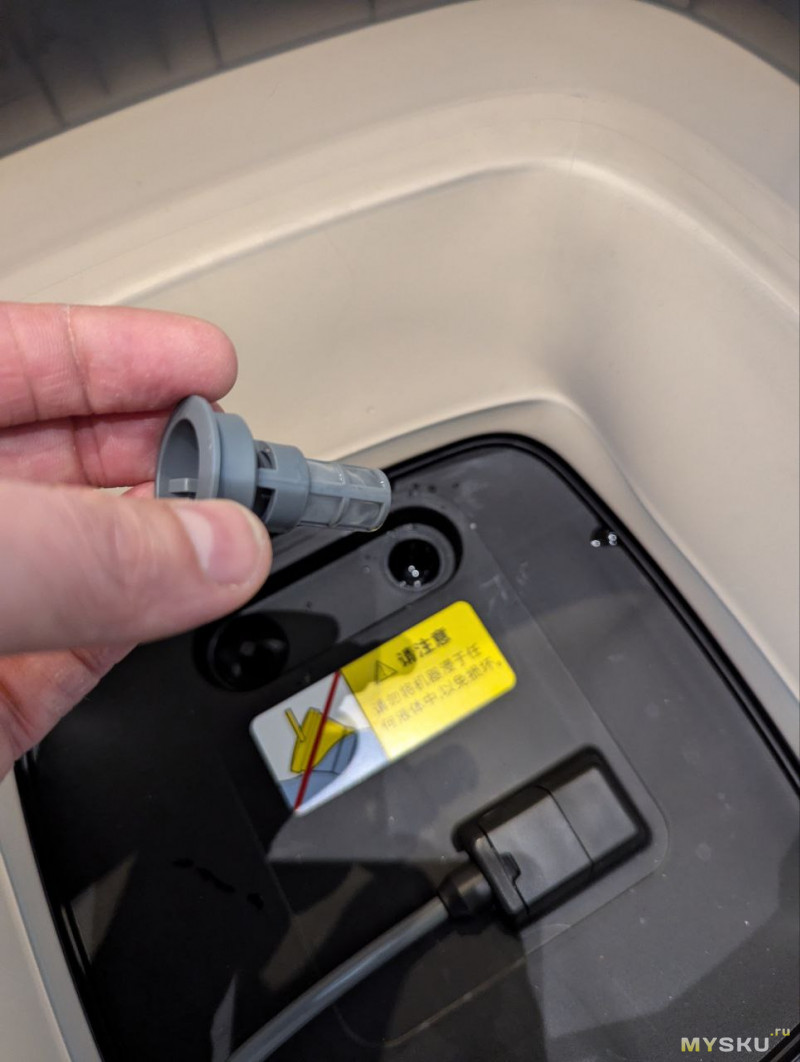 Что ж, пора приступать к тестам. В бак влезло 9 литров воды, даже больше, чем заявленные 8 л. в инструкции. Кстати, зачерпывать воду как обычным ведром тут нельзя, о чем предупреждает наклейка на крышке. Для защиты насоса имеется маленький фильтр.