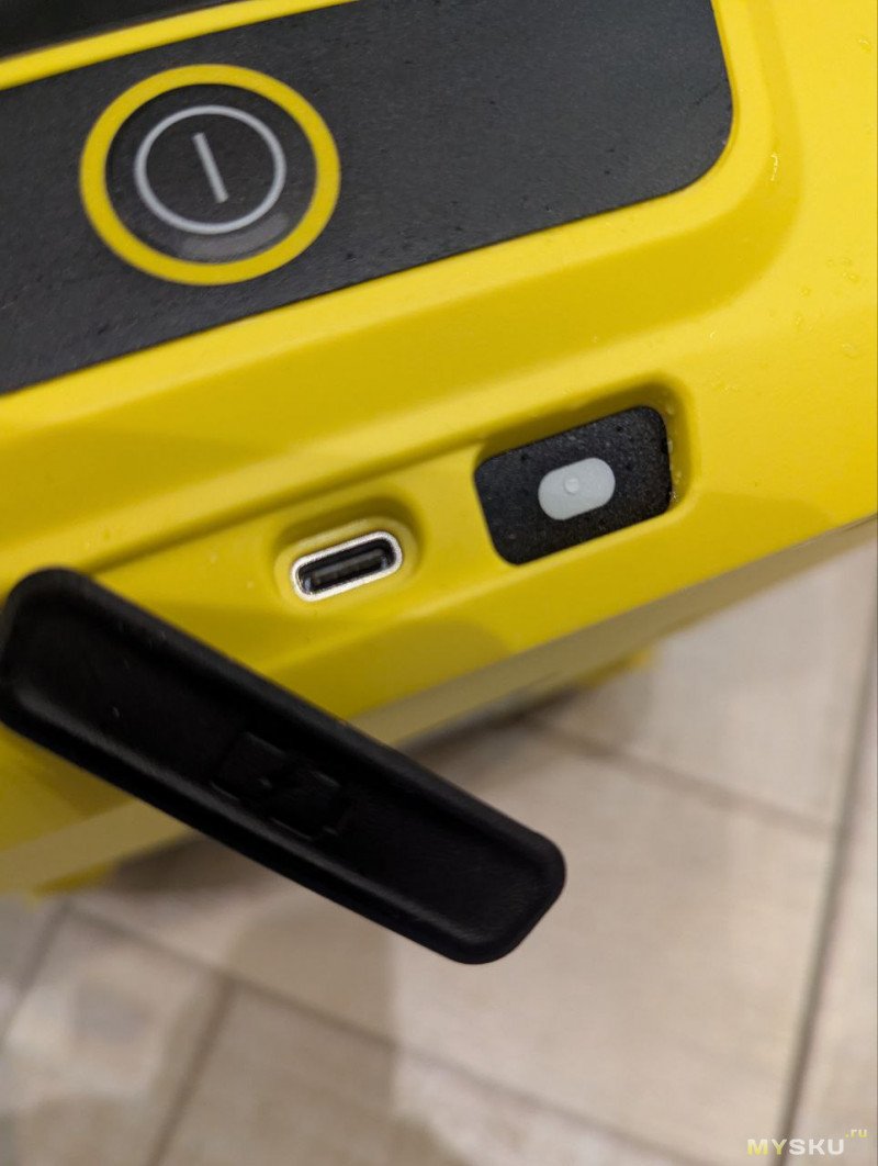 Спереди расположен порт Type-C для зарядки, закрытый заглушкой, кнопка включения и светодиодный индикатор. По его поведению можно отслеживать окончание заряда, а также диагностировать разные состояния мойки, например, то, что батарея скоро разрядится. Более подробно об этом написано в инструкции (на китайском).