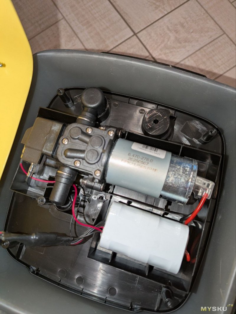 Внутри видим коллекторный мотор достаточно большого размера, состыкованный с насосом, и блок аккумуляторов, предположительно состоящий из двух элементов формата 18650. В инструкции заявлена работа от полностью заряженной батареи в течение 15 минут