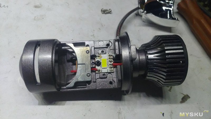 Вскроем. К моему удивлению светодиоды во-первых разные на ближний и дальний, а во-вторых стоят на МЕДНЫХ платах. Правда термопасты там кот наплакал, пришлось добавлять