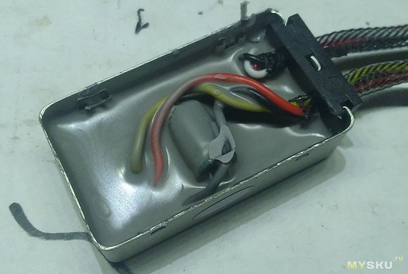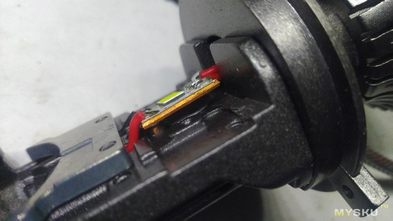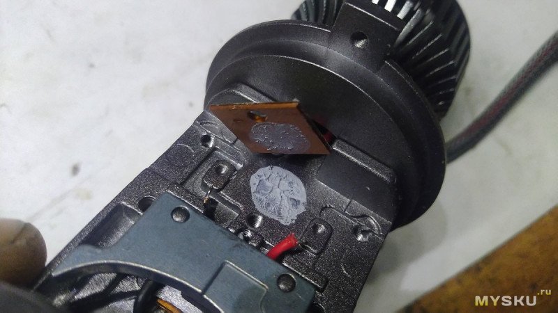 Нагрев. Радиатор возле вентилятора еле теплый, а вот радиатор непосредственно рядом со светодиодами при работе лампочки в открытом виде (не в фаре) греется где-то до 67 градусов. Как ни странно, до примерно такой же температуры греется и драйвер. Он, кстати, залит компаундом