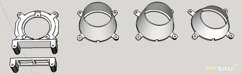 Замечания: наружный кожух закрывает ребра наружного же радиатора, что увеличивает температуру основного радиатора градусов на 5 — как ни странно. «Полочка» для драйвера будет мешать его охлаждению, лучше сделать ее дырявой — впрочем, я пока не ставил на машину, не исключено что от нее придётся и вовсе отказаться, если там нету места. Изнутри фары, возле лампочки, видны головки шрупов крепящих всю конструйню — неаккуратненько, хоть там и не будет видно. Ну и для замены лампочки придётся всё разобрать — то есть снять фару, извлечь внутреннюю часть противотуманки, открутить эти 4 шурупа, снять наружный кожух, открутить лампочку от переходника и далее сборка в обратной последовательности. Изначально я нарисовал просто маску вокруг лампочки чтобы скрыть шурупы, а потом меня осенило и я нарисовал версию 2.0