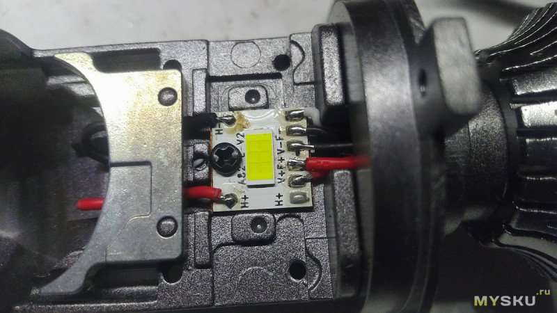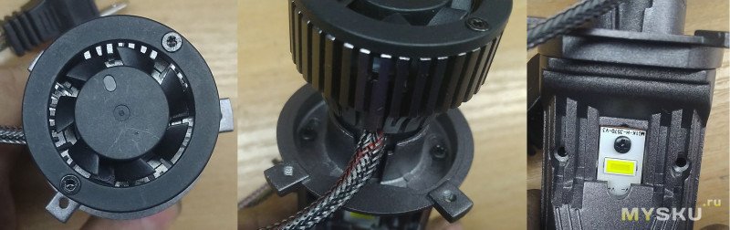 В целом вроде бы всё неплохо, но в отзывах пишут что дальний плохо светит (что логично — у него и мощность довольно маленькая, и светит он через штатный отражатель, а часть света еще и самой лампочкой перекрывается, короче у дальнего тут шансов мало), и что лампочки быстро дохнут. Вот почему дохнут лично мне не совсем ясно, ибо в стационарных условиях нагрев до 70 градусов (кристалл понятно что будет горячее) — не так и критичен. Впрочем, возможно тут плохо передается тепло от подложки на радиатор и от радиатора к его второй части где вентилятор — тут бы какие-то тепловые трубки применять…