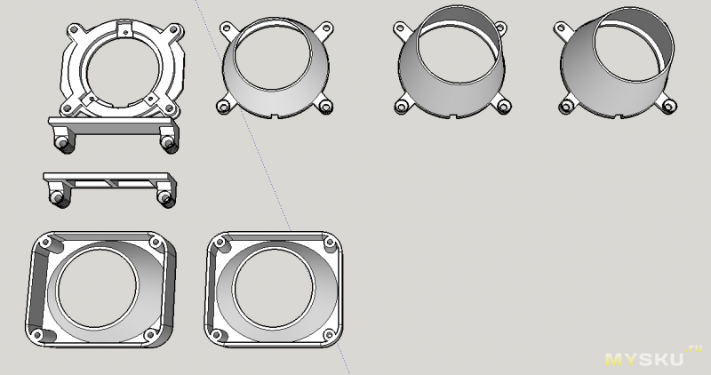 Кожухи тут нарисованы в трех версиях — один пониже, до радиатора, другой пошире. От него я отказался в пользу более низкого. Маска тоже в двух версиях — одна сужается на полмиллиметра к верхней части (если смотреть на картинку) — так должно легче входить в штатную среднюю часть противотуманки. В ней, кстати, нужно будет просверлить 4 отверстия 3мм — через них пройдут шурупы длиной 25 и 30мм.