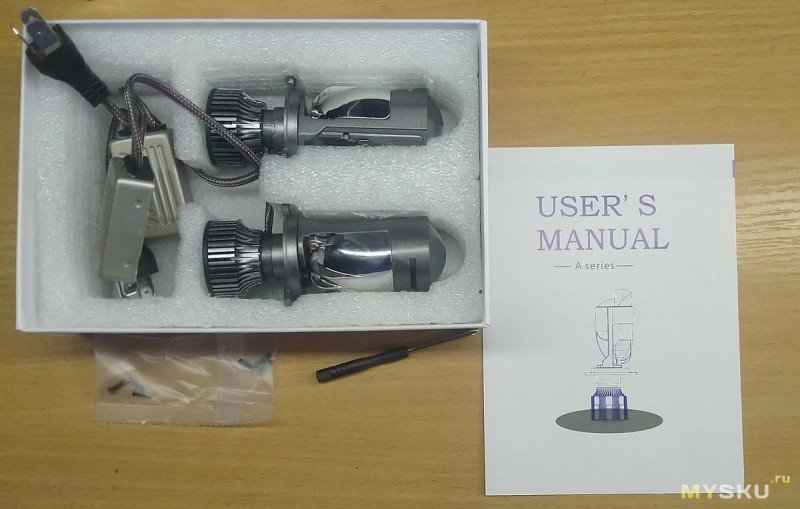Внешний вид и комплектация. В комплекте две лампочки, инструкция, 6 винтиков для крепления лампочек и отверточка на крестик